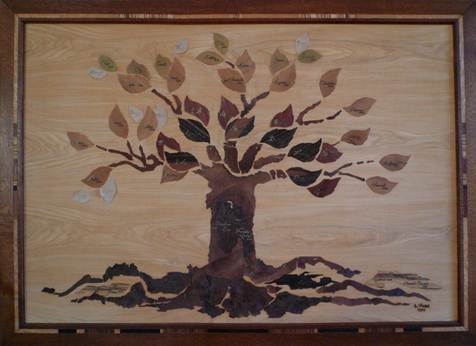 Les racines, le tronc et les feuilles sont decoupés dans un bois de placage, puis collés. J'ai choisi l'érable pour fond afin de mettre en valeur l'intensité de chaque essence. La ronce de noyer et le pin pour les racines, puis le palissandre, l'acajou, le merisier, le poirier et le citronnier.