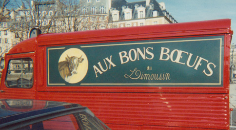 Réalisation d'une enseigne "Aux Bons Boeufs du Limousin" sur chacun des cotés de la camionnette, pour la série TV.
